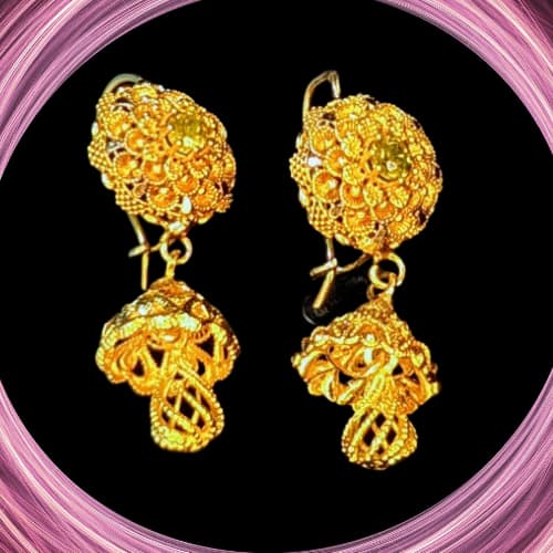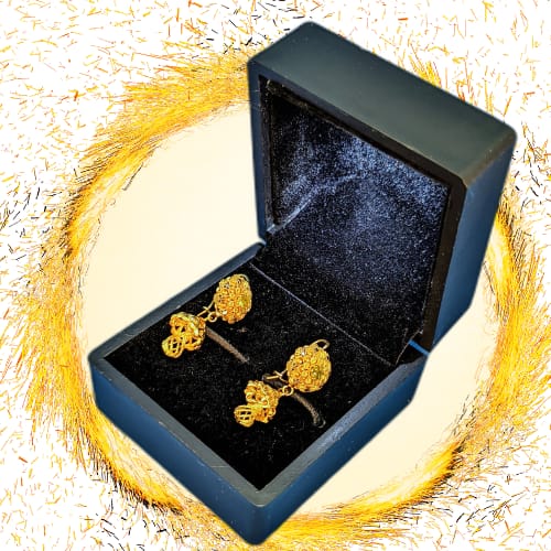 Enhance your style with these exquisite gold-plated filigree drop earrings. Designed with intricate, lace-like detailing, each piece showcases a delicate spherical charm that shimmers with movement. Lightweight and refined, these earrings are perfect for elevating both everyday outfits and formal looks. Beautifully presented in a luxurious velvet-lined box, they also make a thoughtful gift for someone special.