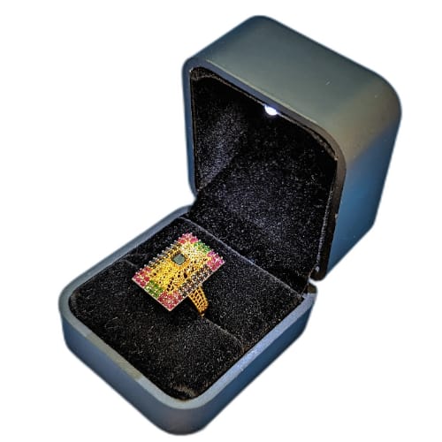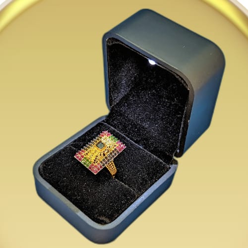 Make a bold and luxurious statement with this exquisite gold-plated rectangular ring. Designed for those who love standout accessories, this ring features a dazzling arrangement of multicolor stones—including shades of green, red, and white—meticulously set in a unique rectangular frame. The intricate detailing and vibrant sparkle make it a perfect choice for festive occasions, weddings, or as a show-stopping gift. Presented in a plush velvet box for a premium unboxing experience.